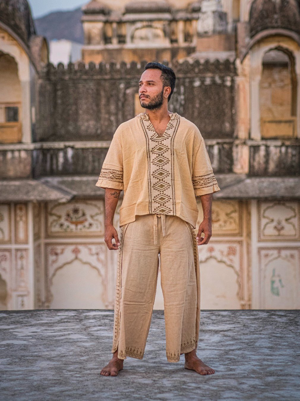 Introducing the "Thai Wrap Pants" – an exquisite embodiment of traditional Thai style and cultural heritage. Crafted from premium cotton fabric in a soothing beige color, these pants offer unrivaled comfort and breathability. With a versatile size accommodating up to a 36-inch waist, they are perfect for both men and women seeking a relaxed fit. The distinctive wrap design gracefully envelops the front and back, while side splits add a touch of allure and freedom of movement. Adorned with captivating blockprint borders, these pants showcase intricate patterns inspired by Thai artistry, paying homage to the country's rich cultural tapestry. Whether you're strolling along sandy beaches, practicing yoga, or simply embracing a bohemian-inspired look, the Thai Essence Wrap Pants are the epitome of elegance and cultural appreciation, allowing you to experience the essence of Thailand wherever you go.