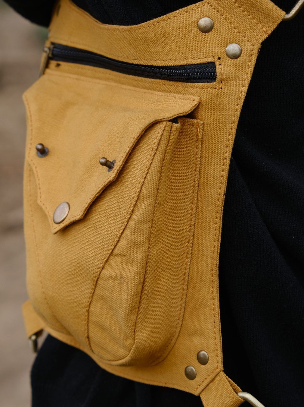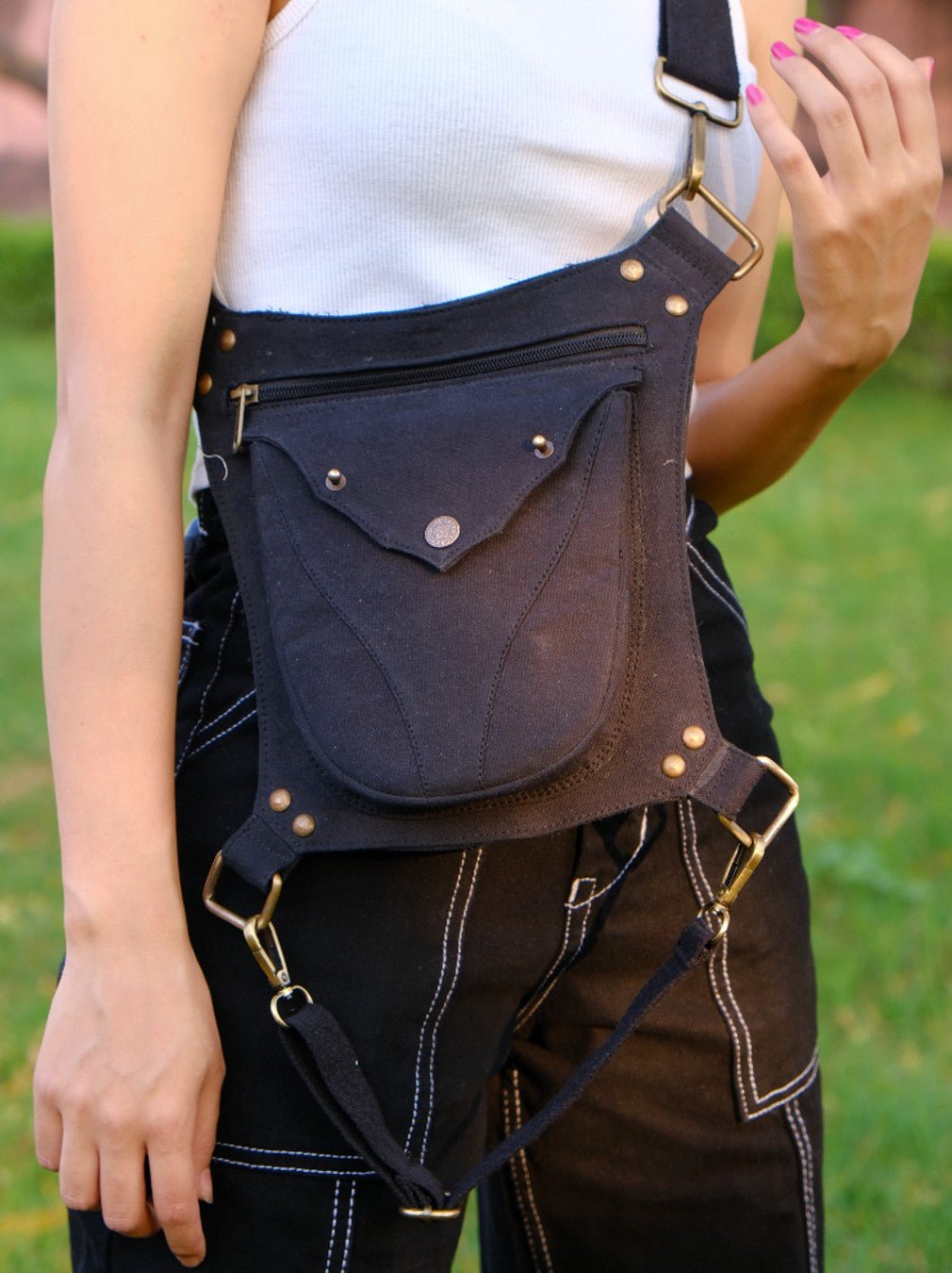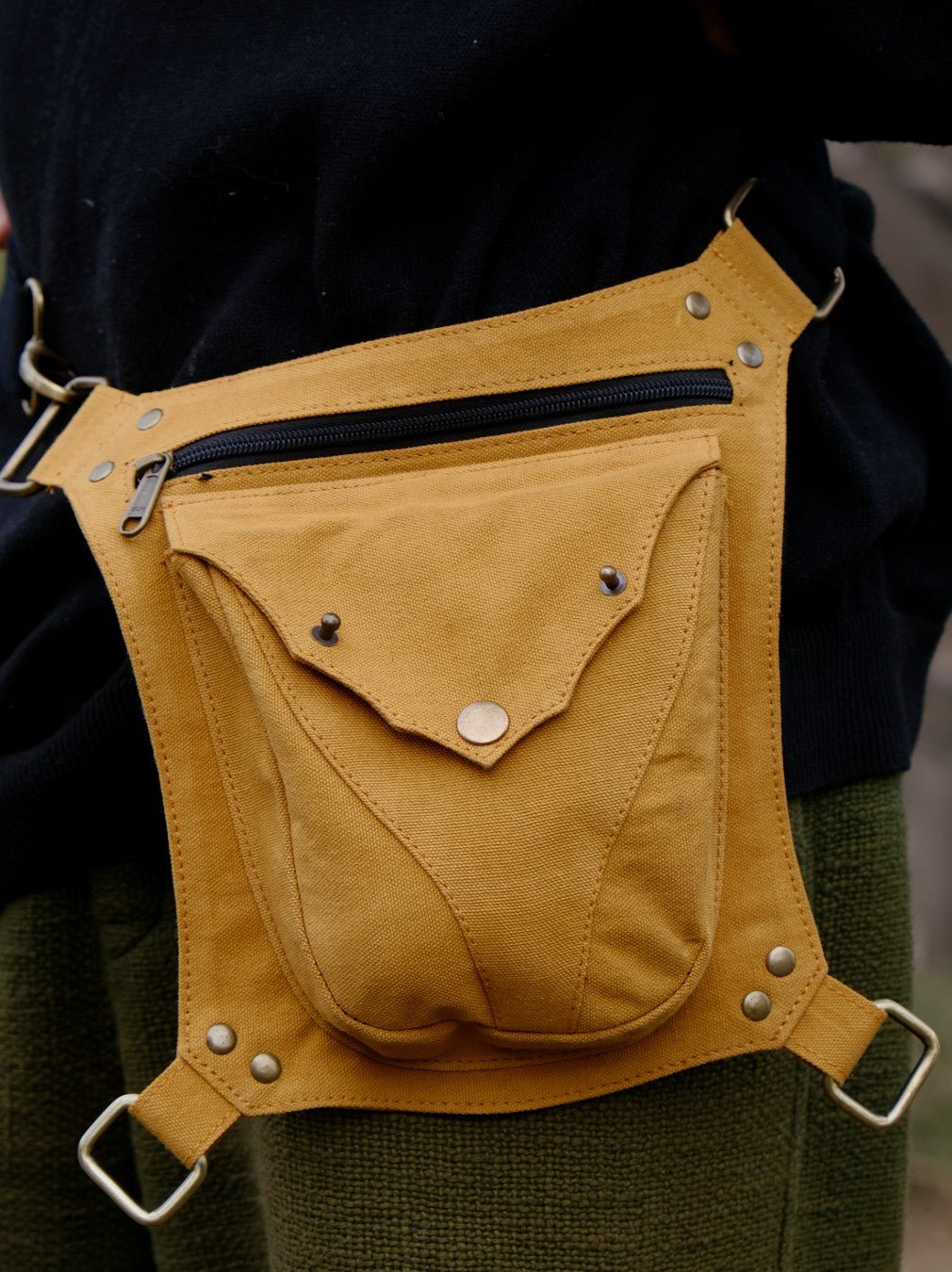 The Rave Pack is the perfect bag for ravers. It can be used as a sling or a waist pouch and features a strap that locks onto your thigh for extra security. The cotton canvas fabric is available in black, green, and sand yellow, and it fits waists measuring 26 to 40. There are two compartments for your belongings.