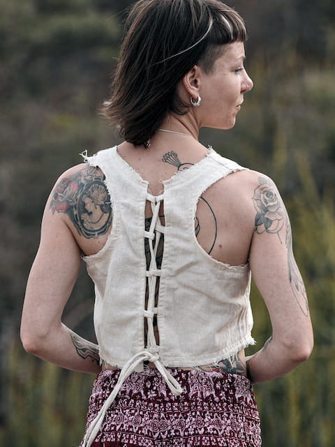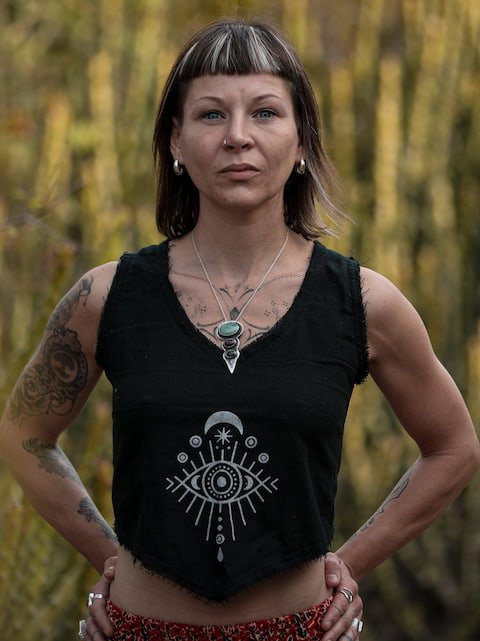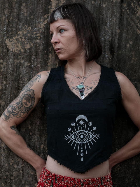 Grab the eyeballs with our black & cream third eye crop top from the hippie collection. The design on the top is as mystical and esoteric as the concept of the third eye. Its made from a blend of jute and cotton. With the unlimited benefits of jute blending it with cotton is a combination of comfort, luxury, and sustainability. Beautiful naturally dyed and hand block printed top can be worn with our elephant mandala pants or the aum skirt from the hippie collection. let's awaken your 3rd eye and let your mind free of chaos around you.