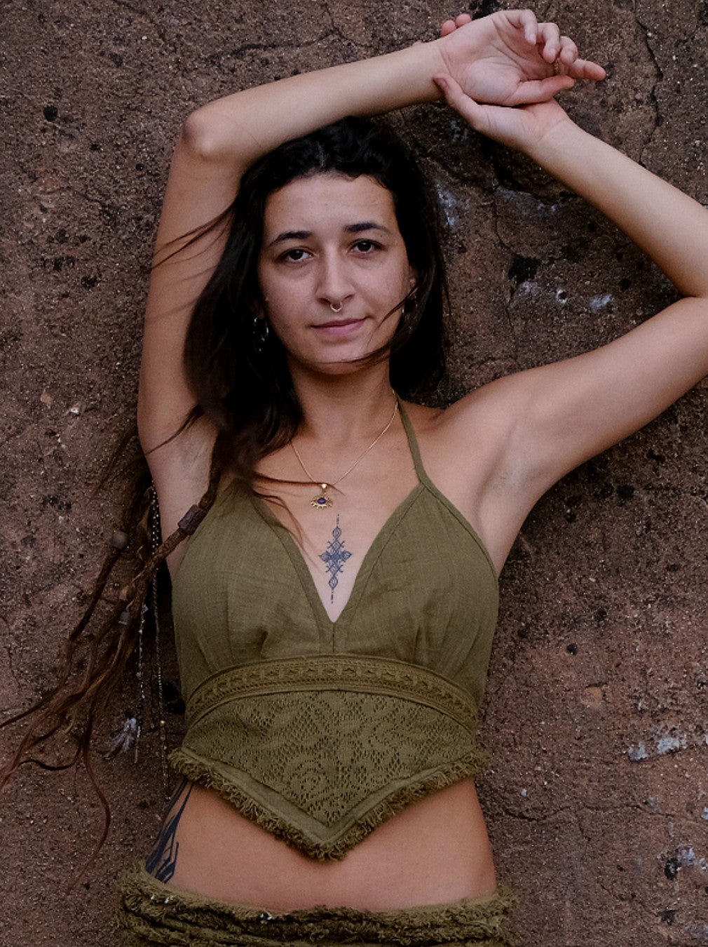 Step into a fairy wonderland in this Titania crop top. This playful tie top is inspired by the beautiful creatures of the forest, with a frayed hem and dainty little wings. available black and green cotton, it's perfect for festival season – just pair with your favourite shorts or skirts and you're good to go!